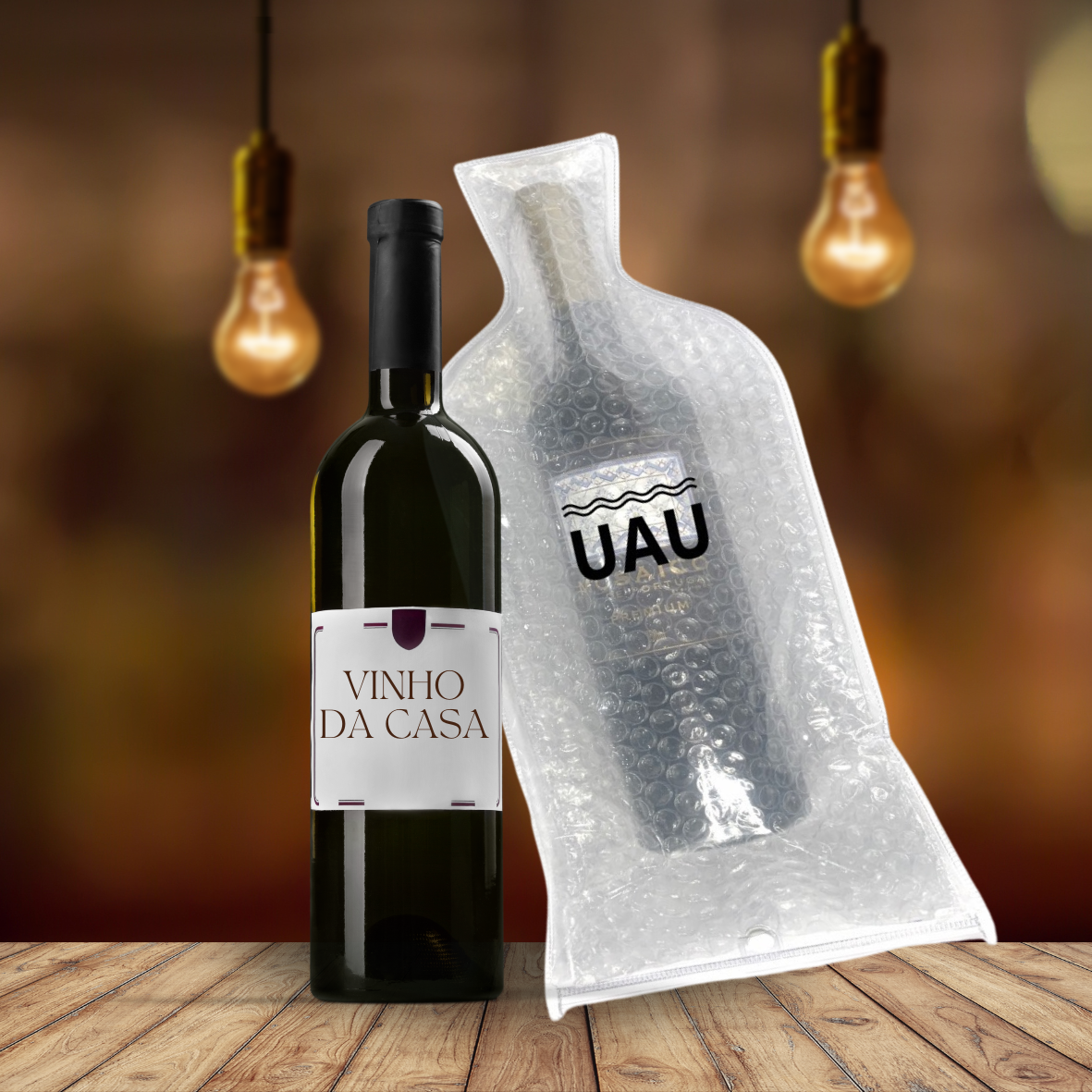 O Protetor de Garrafa de Vinho em plástico bolha da Loja Achei é lavável e reutilizável. Revestido com bolhas em toda a sua superfície interna e com fechamento de botão.